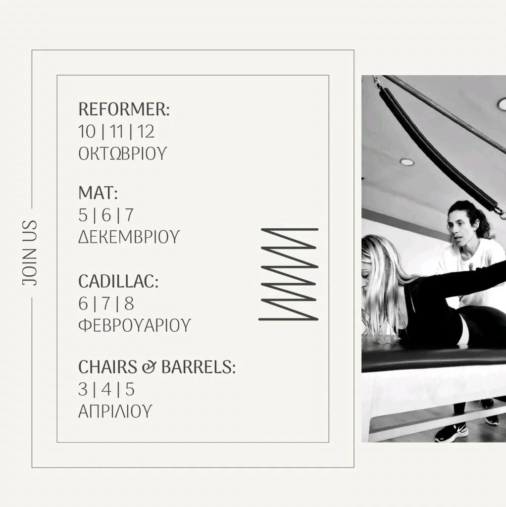 Training at Cosmos Pilates in Athens. These workshops feature Reformer in October, Mat in December, Cadillac in February and Chairs and Barrels in April. Contact hello@stretchpilates.gr for more information.